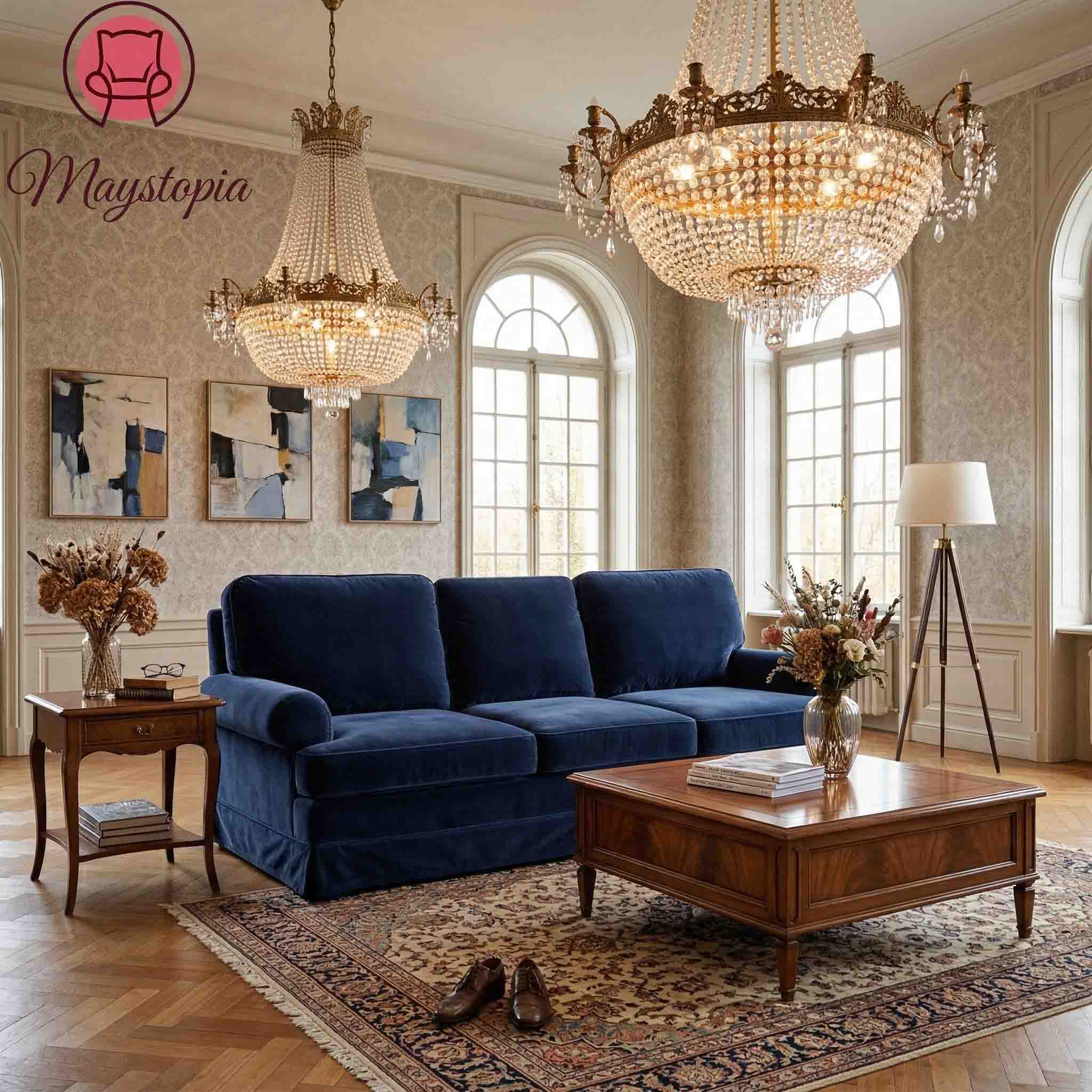This luxury navy blue velvet 3-seater retro sofa features premium navy blue velvet upholstery, bringing classic 1980s charm. Combining a solid wood frame, supportive bouncy foam, and rich navy blue velvet upholstery, this piece blends retro aesthetics with superior structural stability. Classic navy blue design adds an elegant touch to any living space.