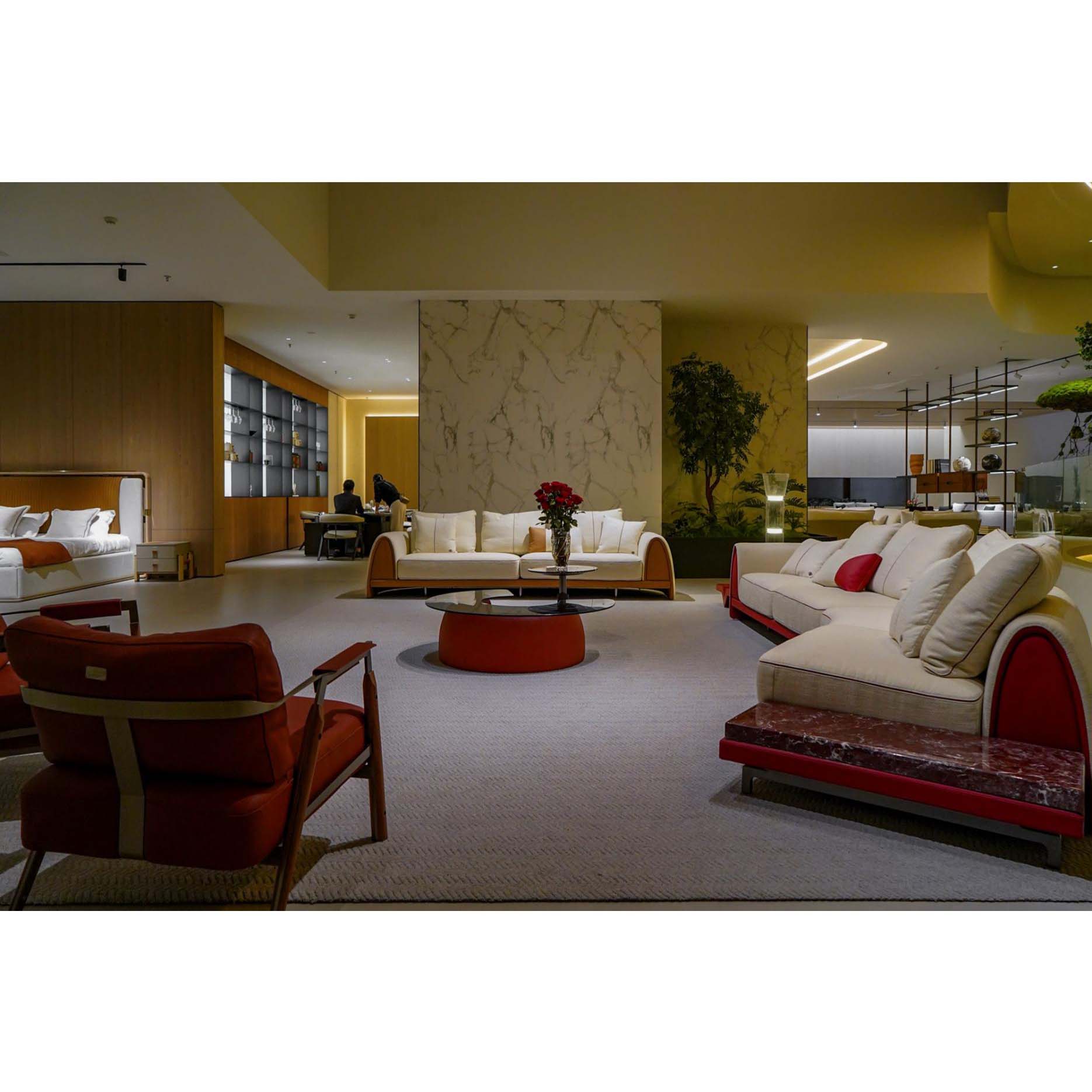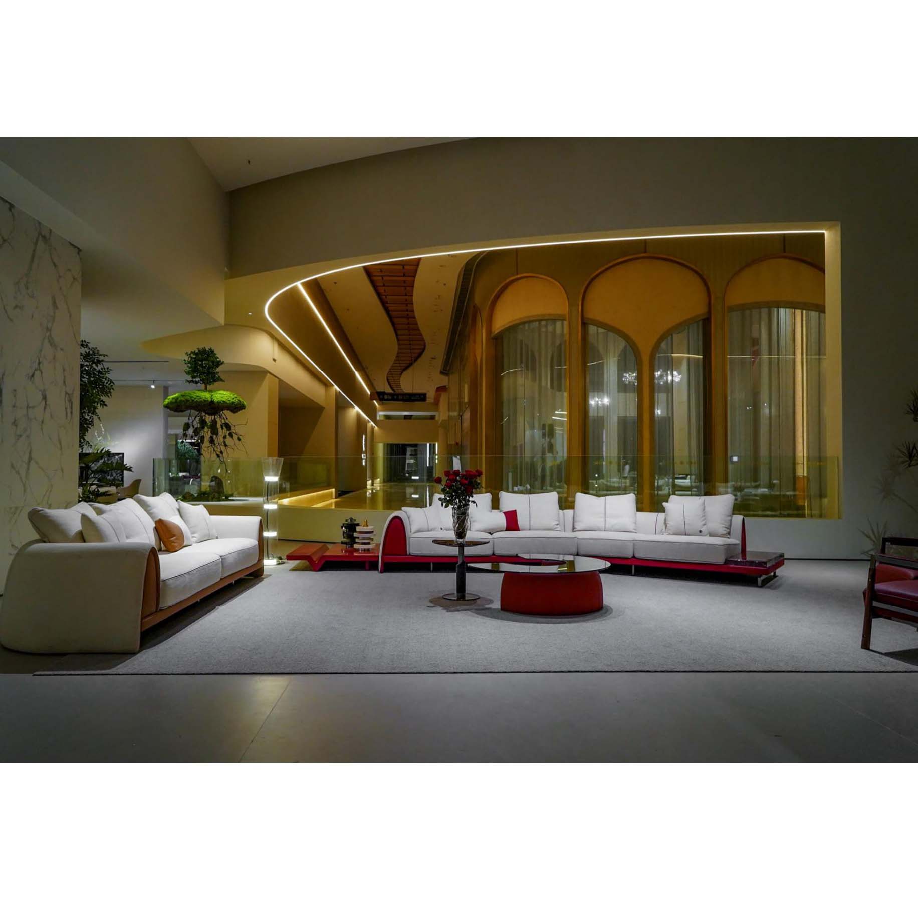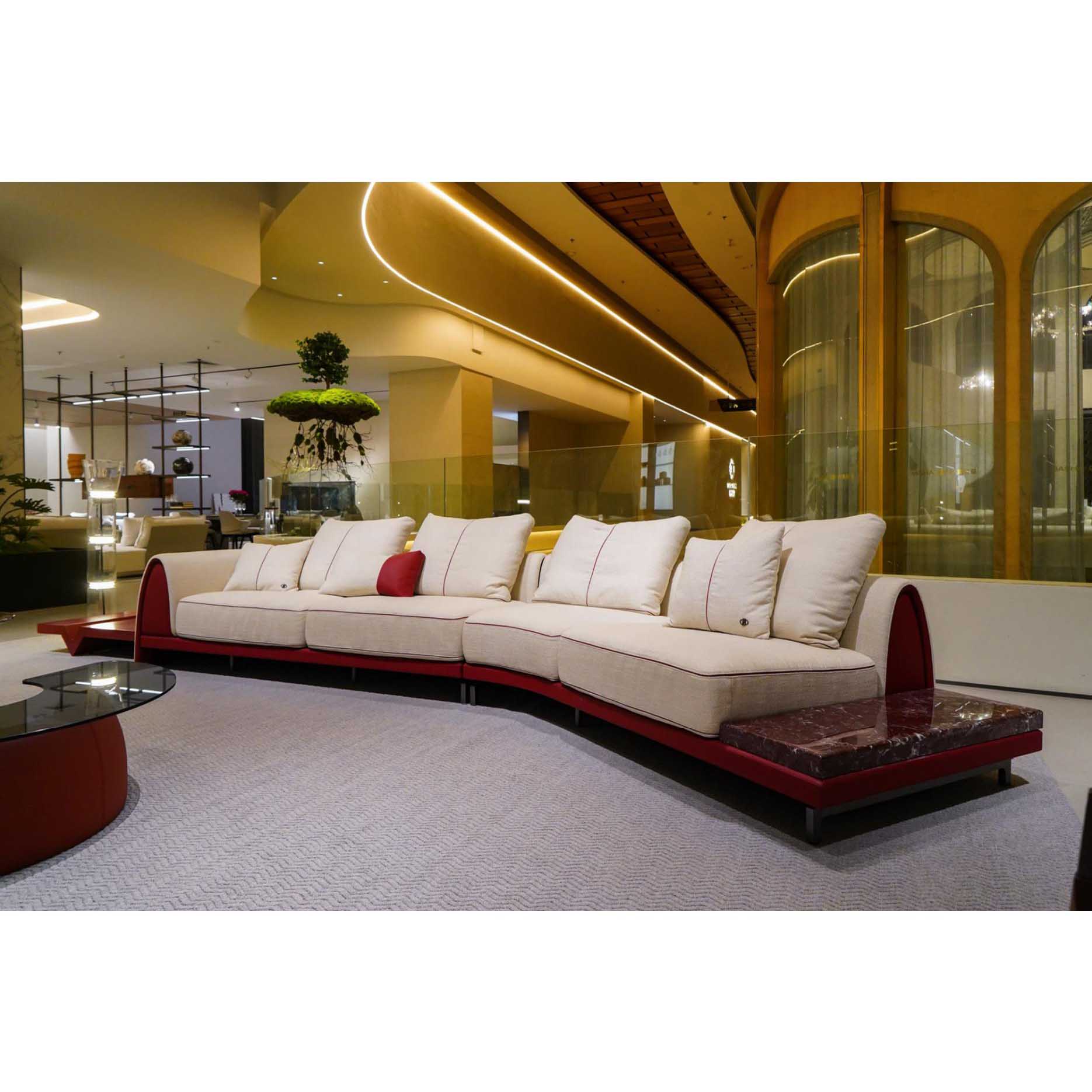 Introducing our Classic Luxury Modular Sofa with Marble Side Table – a bold yet elegant statement piece tailored for high-end residential and hospitality spaces. This unique modular design blends sculptural curves with refined functionality, offering exceptional comfort without compromising on aesthetics. Upholstered in premium neutral fabric and set against a rich burgundy frame, the sofa’s silhouette gently arcs, inviting conversation and relaxation.